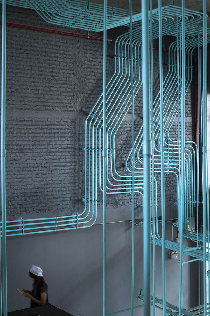 Hubba-to的創意靈感源自于Hubba的網絡狀標志圖形,設計強化并延續這種網絡線條,將其演化為有趣的空間元素,蔓延穿梭于一至二樓從而形成統一的視覺空間。這樣的構想之所以能實現,是因為現實施工中確實存在許多的機電設備管線。Supermachine設計團隊只要善加利用這些管線、并刻意強化增加管線系統、然后有目的的設計組織管線安裝路徑。縱橫交錯的管線一律噴成漂亮的綠松石色彩,流暢的藍綠色管道在墻面、天花、空間中婉轉穿梭,營造出令人震撼的視覺效果,為沉重的工業風帶來靈動和創新。