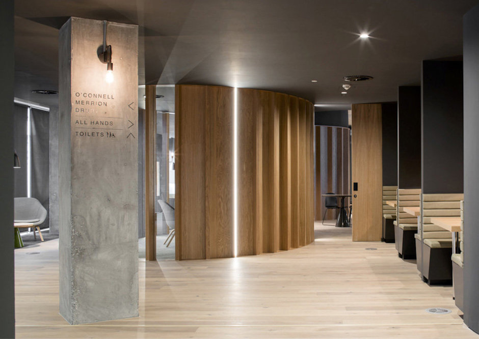 室內的主動線被設想成典型的都柏林街道,蜿蜒流動。這條“街道”是一個充滿活力的信息分享公共空間。沿著這條主動線,是星羅棋布的分支路線由路標指向會議室、社交區和工作區等。這些路線均按都柏林真實的道路名來命名。所有的道路最終匯聚在位于中心的全體集會空間,同時這里也是與全球其它辦事處聯動舉辦重要發布的活動現場。